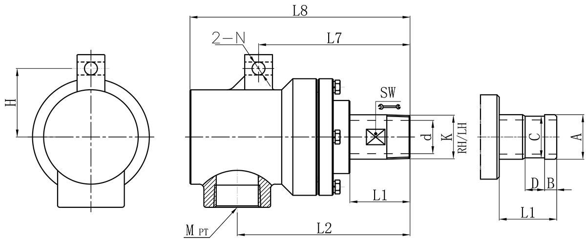| Model | K | M | d | L1 | L2 | L7 | L8 | N | H | SW | 法蘭式外管尺寸對照表 | |||