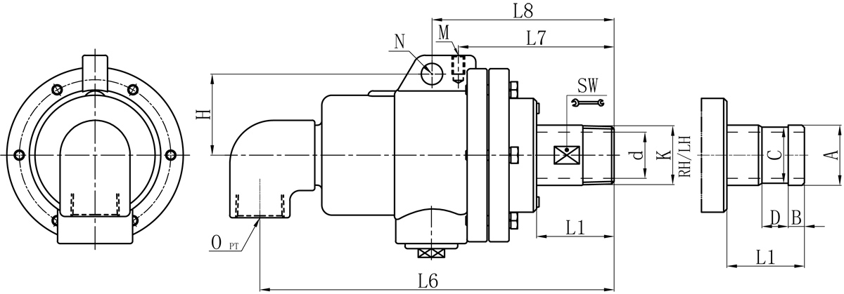 | Model | K | O | d | L1 | L6 | L7 | L8 | M | N | H | SW | 法蘭式外管尺寸對照表 | |||