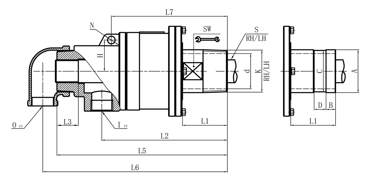 | Model | K | M | I | O | S | S1 | D1 | L1 | L2 | L3 | L5 | L6 | L7 | L8 | N | SW | H | 法蘭式外管尺寸對照表 | |||