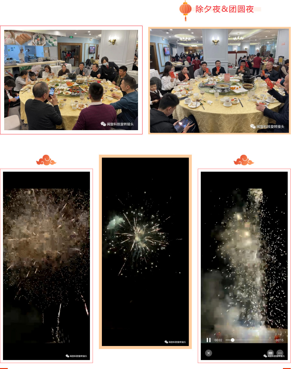 2月11日晚(大年三十除夕夜),公司早早的在泉州酒店準(zhǔn)備了豐盛的年夜飯,創(chuàng)始人朱斌與留司職工及其家屬一起共度新春佳節(jié),舉杯同慶新年到來,并發(fā)放了除夕紅包1000元/人。同時回司后再一起舉辦了一場盛大的煙火宴會,在嗶哩啪啦的鞭炮聲中和一片歡聲笑語中共同迎來了嶄新的一年。